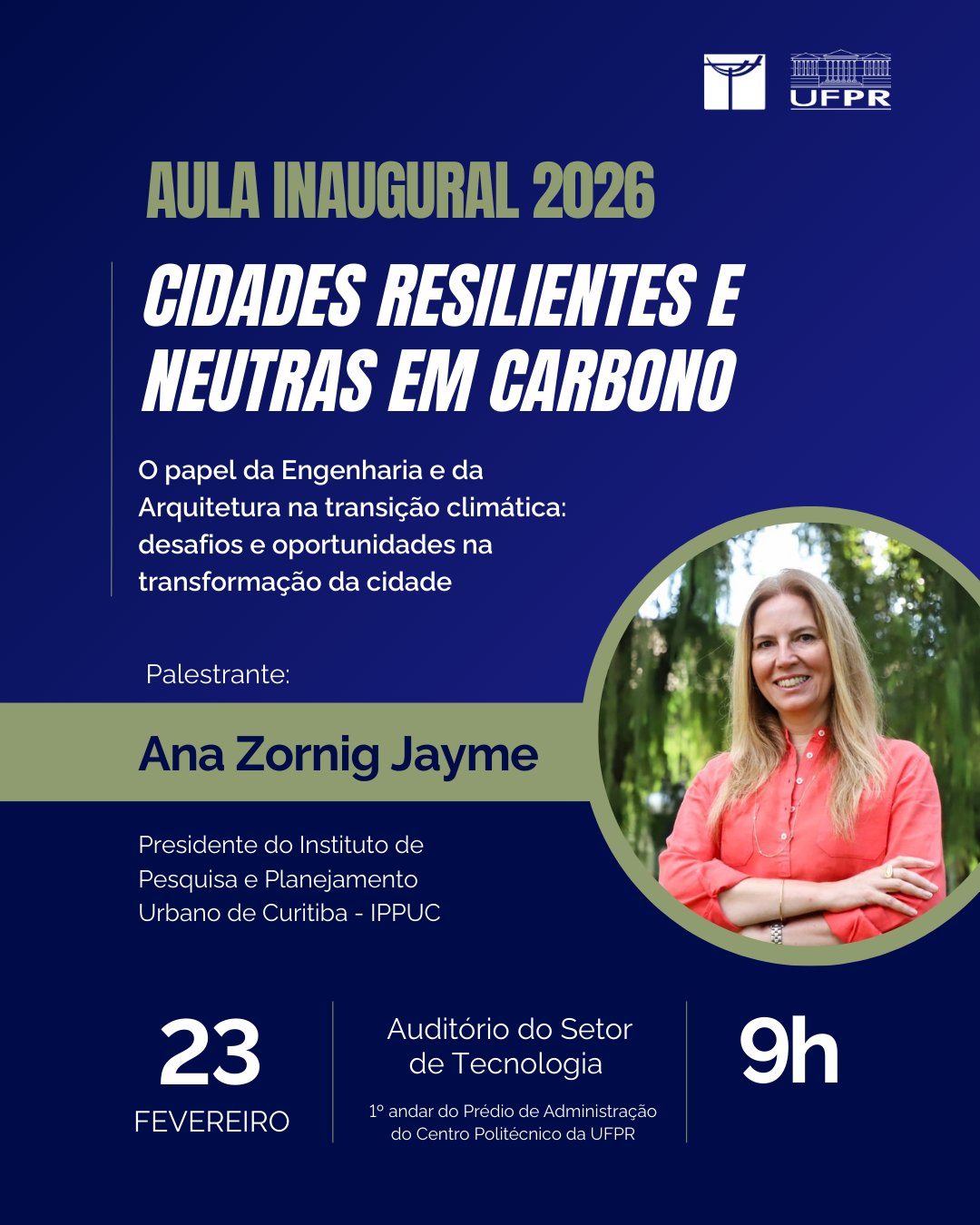 A aula inaugural será ministrada por Ana Zornig Jayme, presidente do Instituto de Pesquisa e Planejamento Urbano de Curitiba (Ippuc) e primeira mulher a ocupar o cargo nos 60 anos de história do órgão. A palestra tem como tema “Cidades resilientes e neutras em carbono†e vai discutir o papel das engenharias e do planejamento urbano na transição climática.