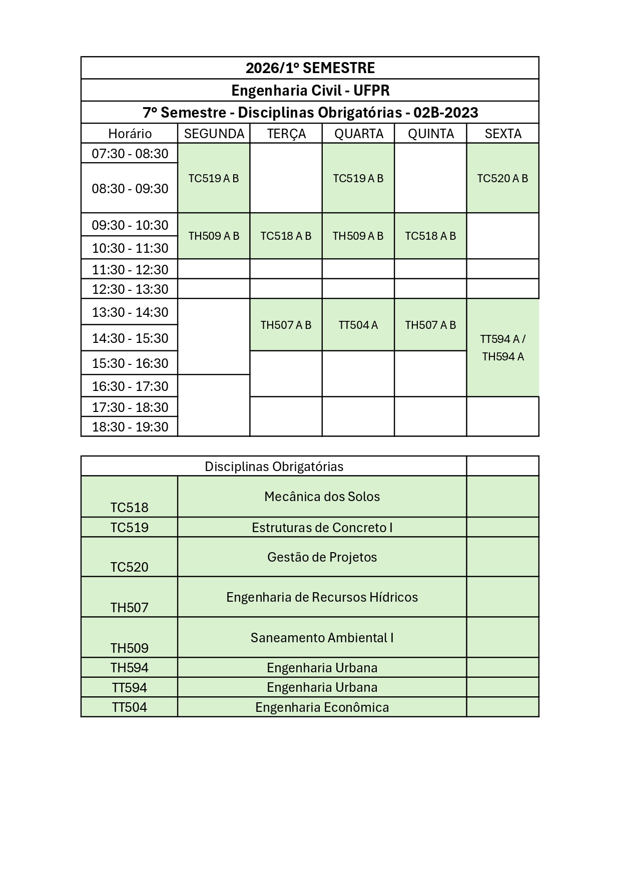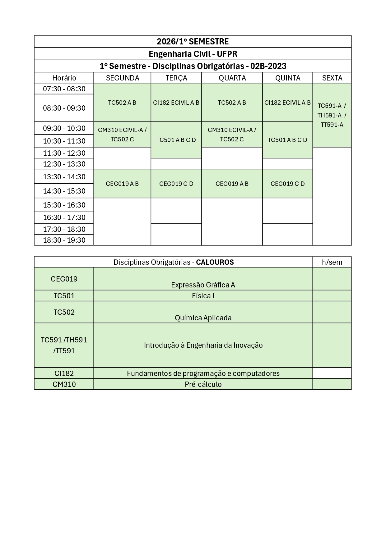 Consulte aqui a Grade de Disciplinas disponíveis para matrícula para o Primeiro Semestre de 2026, por currículo.
